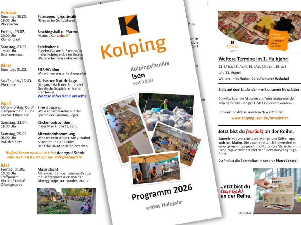 Im Programm finden sich unsere vertrauten, jährlich wiederkehrenden Termine – etwa der Emmausgang, die Altmaterialsammlung und unsere Maiandacht. Außerdem findet weiterhin der monatliche Spieleabend im Brunauerhaus statt. Aufgrund des großen Zuspruchs in den vergangenen Jahren veranstalten wir am 14./15. März zum dritten Mal die Isener Spieletage im Pfarrheim.
